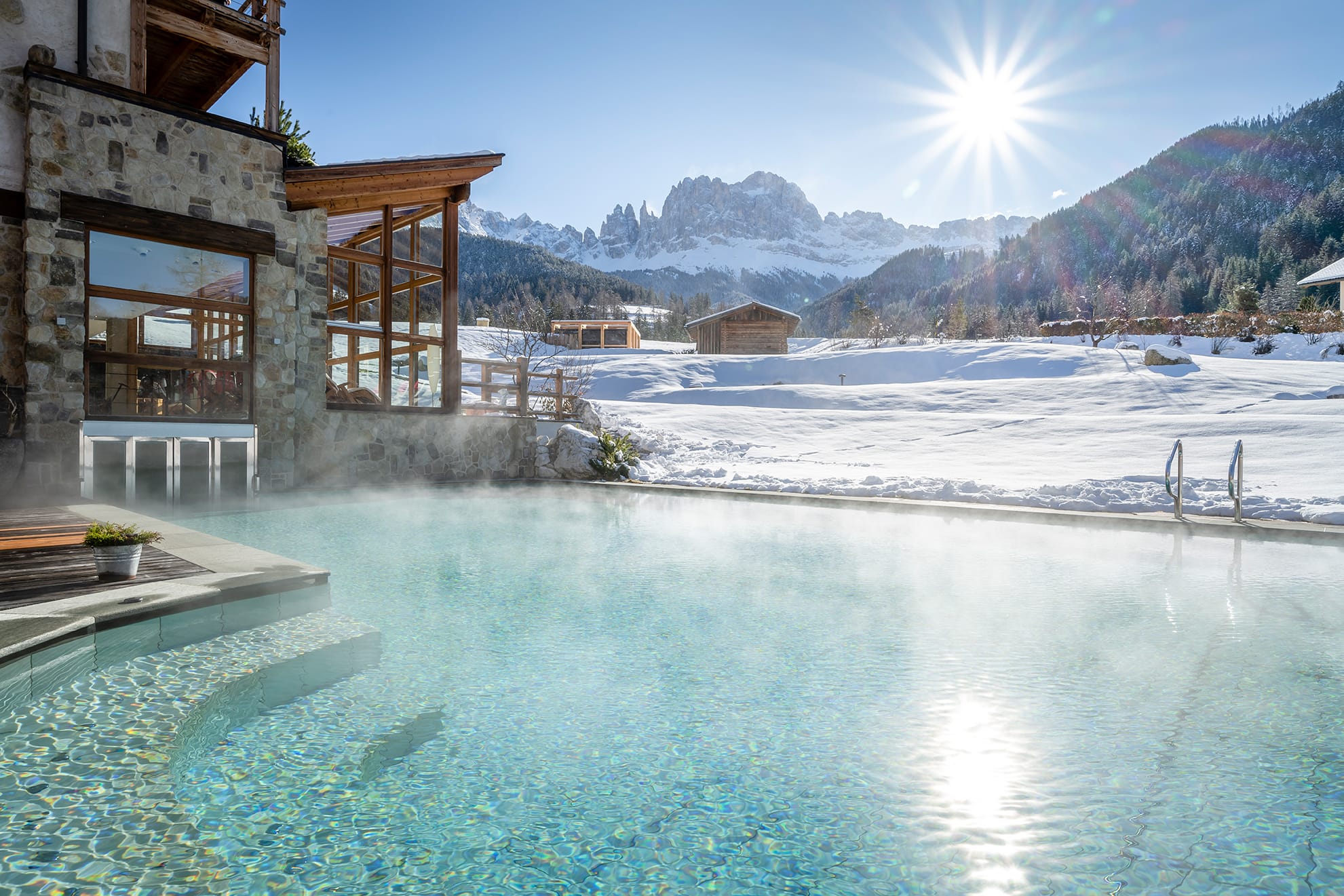 Another stand out feature of the resort is the spa and wellness area. Stretching over 2,400 square metres, the pool and sauna area contain all the features to be expected in a five-star resort hotel of this quality but also a number of unique elements which certainly add to its overall attraction. These include the Schupfensauna, located outside the main hotel building in the middle of the adjoining alpine meadow with an unobstructed view of the Catinaccio.